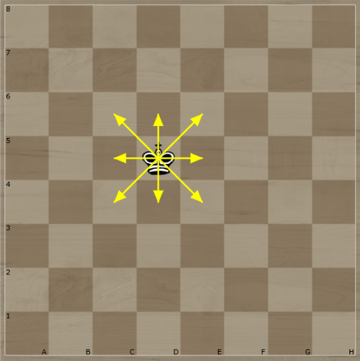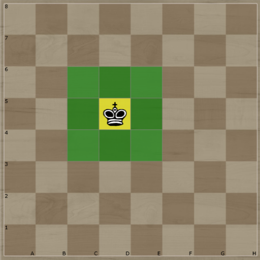 The King moves in straight lines, and can move in eight (8) directions, just like the Queen.